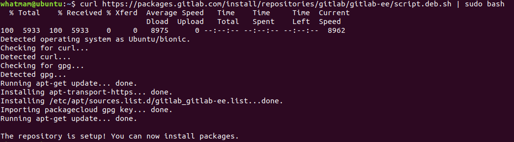 $ curl https://packages.gitlab.com/install/repositories/gitlab/gitlab-ee/script.deb.sh | sudo bash