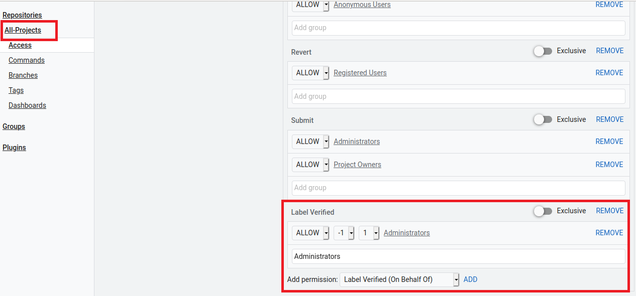 # label-Verified = -1..+1 group Administrators 코드리뷰 Verified 권한 부여