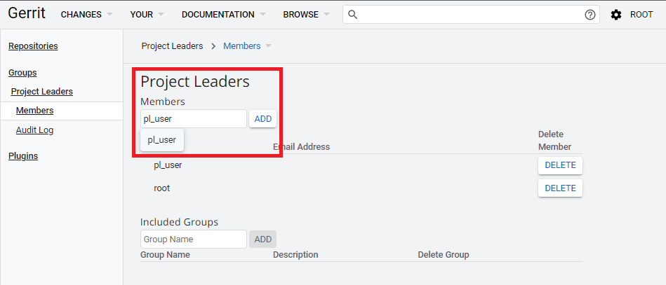 Members 클릭하여 "pl_user" 계정을 Project Leaders 그룹에 추가한다.